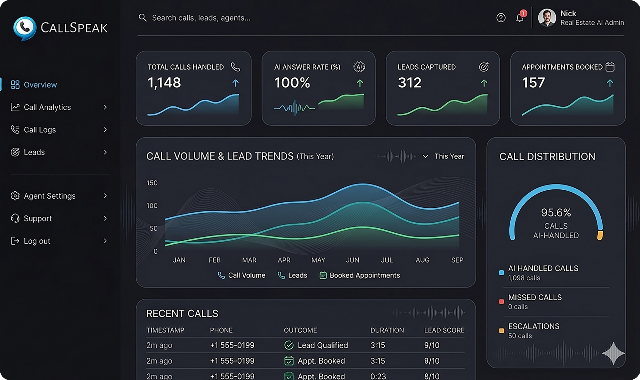CallSpeak’s AI voice agents answer questions, resolve issues, book appointments, and qualify leads — 24/7, with natural human-like conversations.